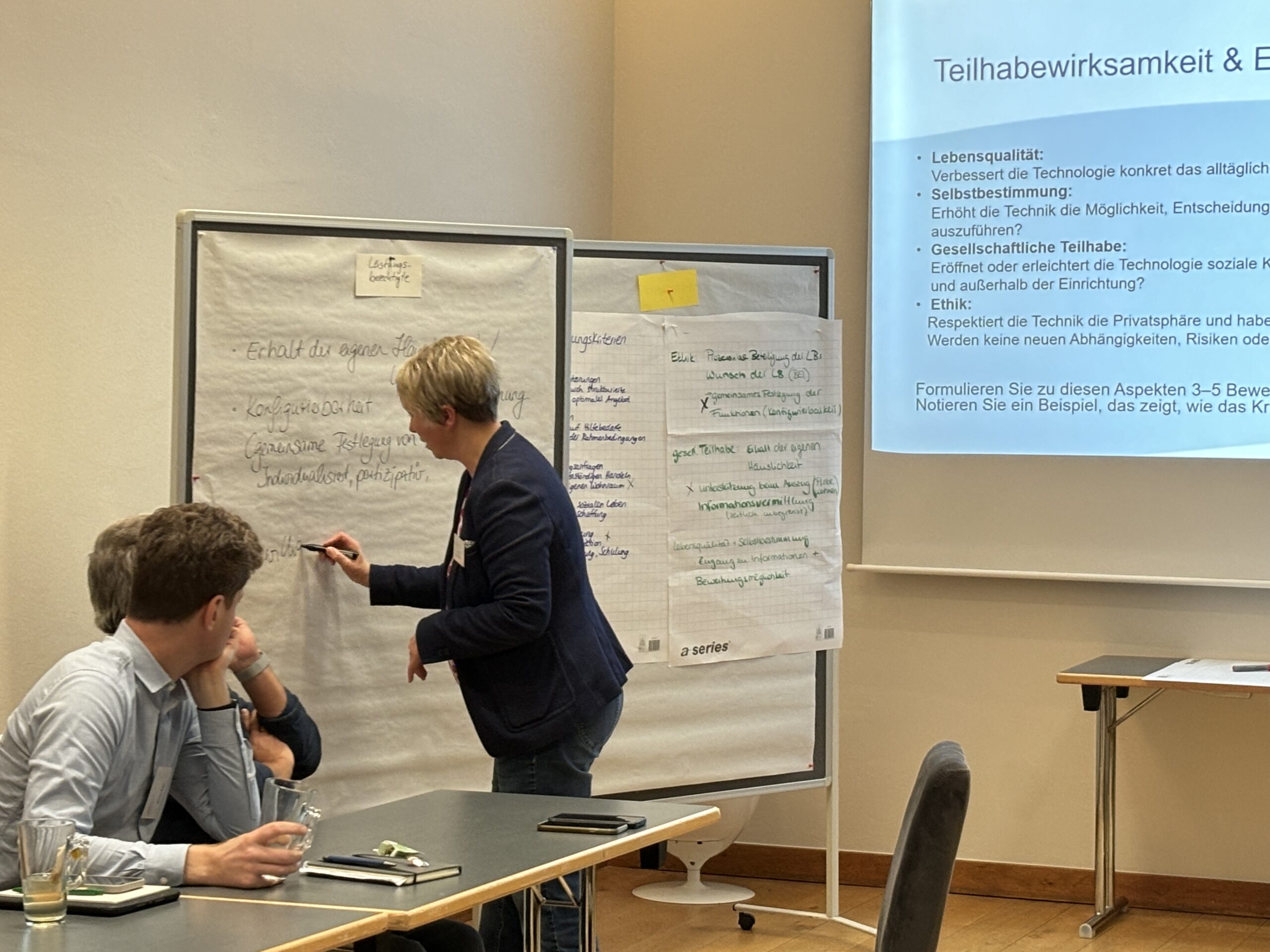 In den Workshops wurde der Nutzen durch den Einsatz assisitiver Technologien aus unterschiedlichen Perspektiven (Leistungsberechtigte, Mitarbeitende, Leistungserbringer und Leistungsträger) unter Berücksichtigung der drei übergeordneten Dimensionen (Teilhabewirksamkeit, Personaleffizienz und Prozesseffizienz) diskutiert. Ziel ist die Weiterentwicklung ausgewählter Produkte und Anwendungen insbesondere im Hinblick auf die Teilhabewirksamkeit.